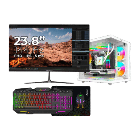 Potente equipo de escritorio equipado con procesador AMD Ryzen™ 5 8500G de 6 núcleos y gráficos integrados Radeon™ 740M, ideal para tareas exigentes, multitarea y entretenimiento. Incluye 16GB de RAM DDR5 y un veloz SSD M.2 NVMe de 1TB para arranques rápidos y fluidez en aplicaciones. Acompañado de un monitor Janus de 23.8″ Full HD, con 100 Hz de tasa de refresco y 1 ms de respuesta, perfecto para una experiencia visual más fluida. Excelente conectividad, expansión futura y listo para productividad o gaming ligero.