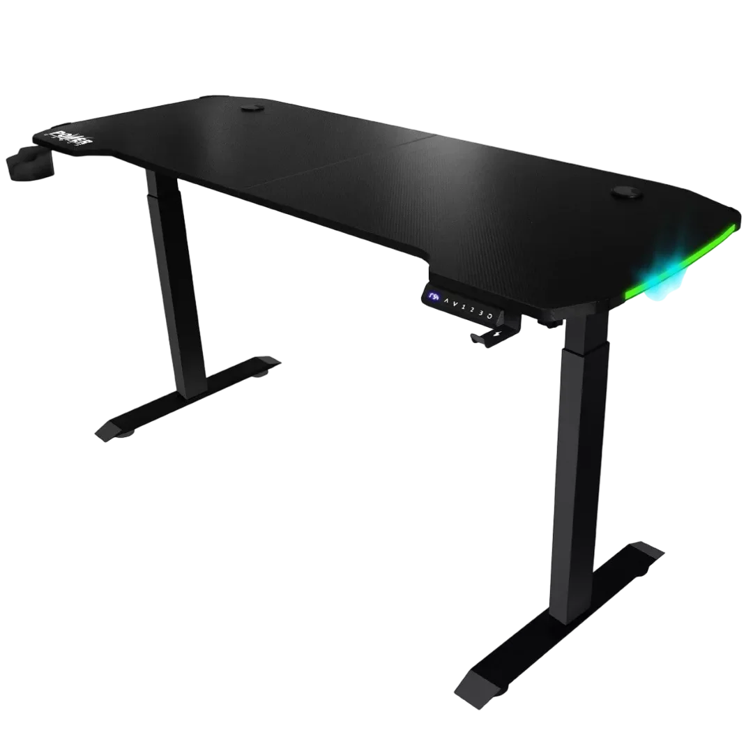 El Power Group AY-1 es un escritorio gamer moderno y funcional, pensado para brindar comodidad, estilo y versatilidad. Su superficie superior está fabricada en fibra de carbono para garantizar durabilidad con un diseño limpio. Este modelo destaca por su altura ajustable eléctricamente entre 73 cm y 105 cm, lo que permite adaptarlo fácilmente a tus necesidades, ya sea sentado o de pie. Además, incorpora iluminación RGB en sus bordes para ambientar tu espacio de juego, junto con soportes integrados para tu diadema y bebida.