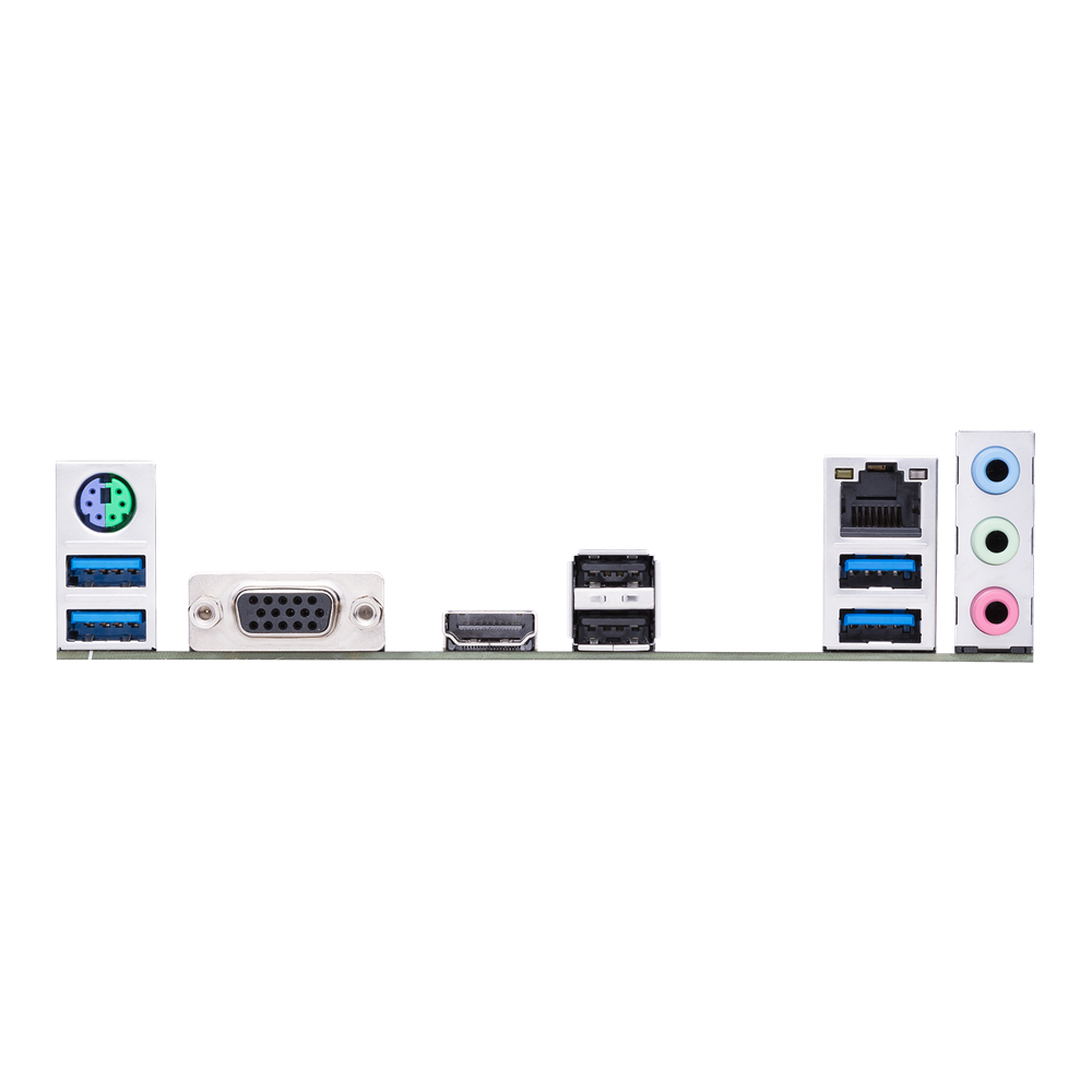 • Puertos de E/S del panel posterior: 4 puertos USB 3.2 Gen 1 (4 x Tipo A) – 2 puertos USB 2.0 (2 x Tipo A) – 1 puerto D-Sub – 1 puerto HDMI ™ – 1 puerto Ethernet Realtek RTL8111H de 1 Gb – 3 conectores de audio – 1 puerto combinado PS/2 para teclado/ratón