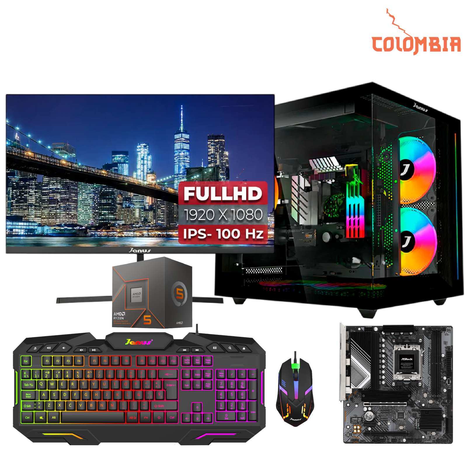 PC gamer todo en uno con Ryzen 5 8600G y gráficos integrados, ideal para gaming ligero, estudio y trabajo. Incluye monitor de 22”, 16GB DDR5 RGB, SSD NVMe de 512GB y combo gamer listo para usar.