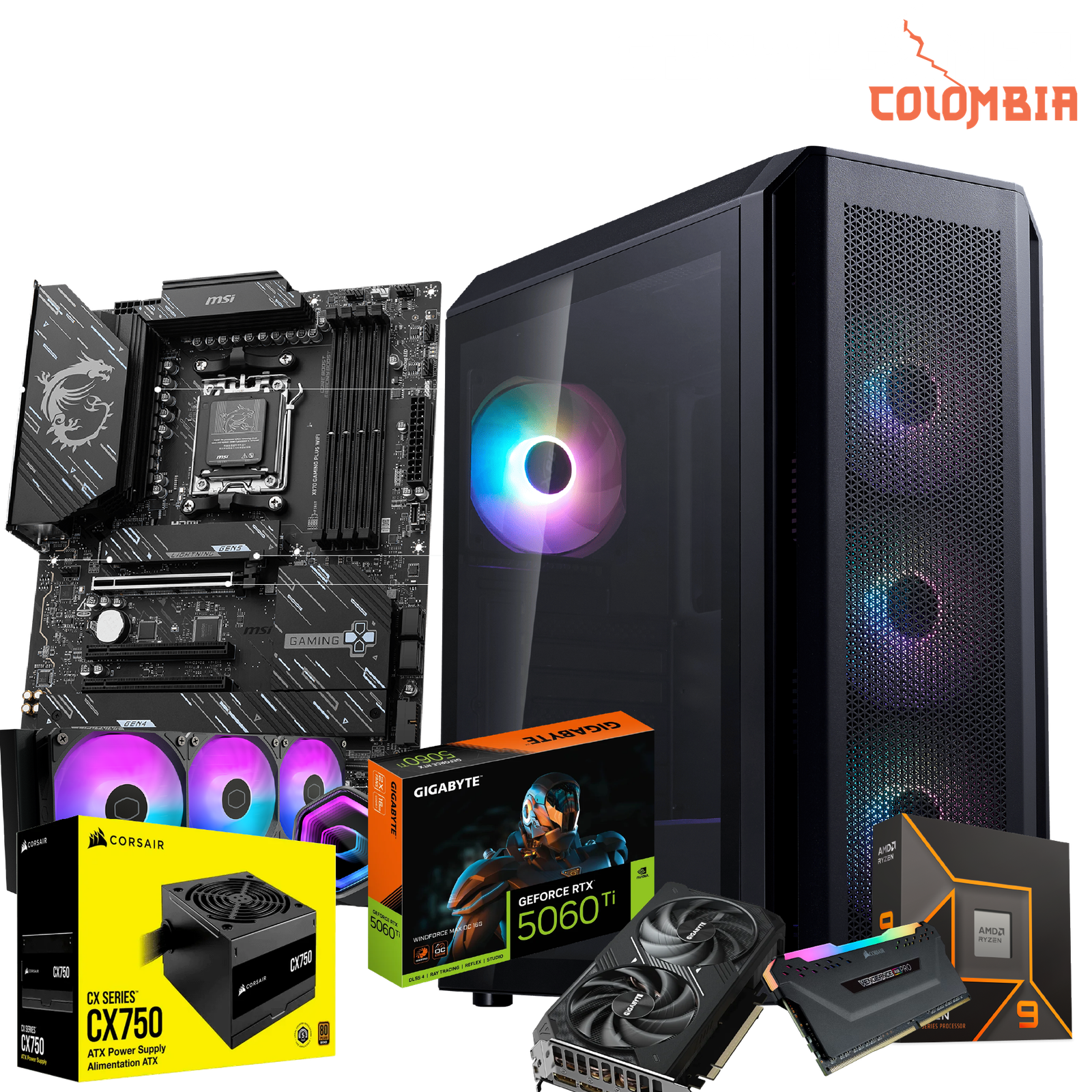 PC Gamer Ryzen 7 9800X3D + RTX 5060 Ti 16GB | 16GB RAM Corsair | SSD M.2 NVMe 1TB | Board MSI X870 | Refrigeración Líquida 360mm | Fuente 750W Bronze | Chasis Valor Air Plus
