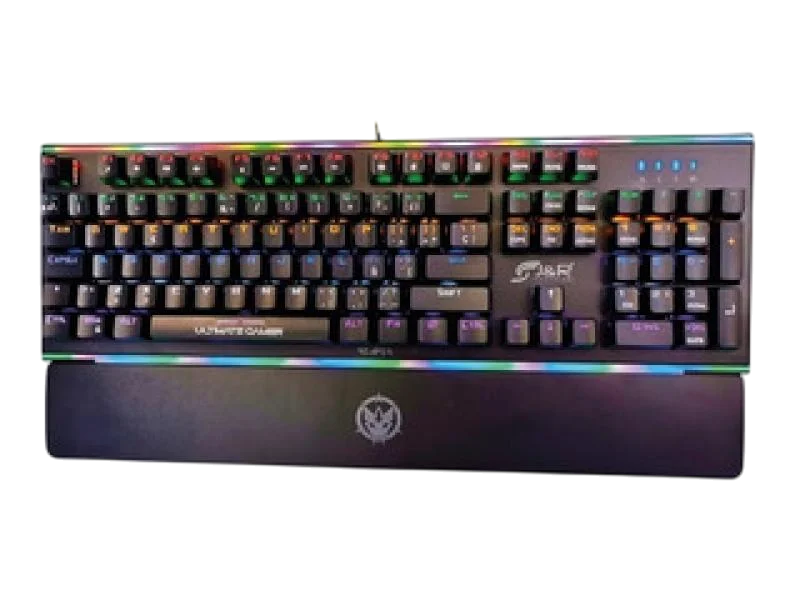 El teclad Reaper con sus switches Brown no te decepcionara, sus teclas en doble inyección de ABS dan mayor durabilidad con una vida útil de hasta 80 millones de pulsaciones, en formato español así que tiene incluida la «Ñ». Cuenta con 12 teclas multimedia y 104 teclas antighosting. Con iluminación Led tipo Rainbow. Puede intercambiar de manera fácil los switches por su sistema Hot Swap. Con cubierta de aluminio, protección IPX4 resistente a salpicaduras, 1.5m longitud del cable y unas dimensiones: 44.8*14.3*4 cm y 850g de peso, incluye unn apoya muñecas.